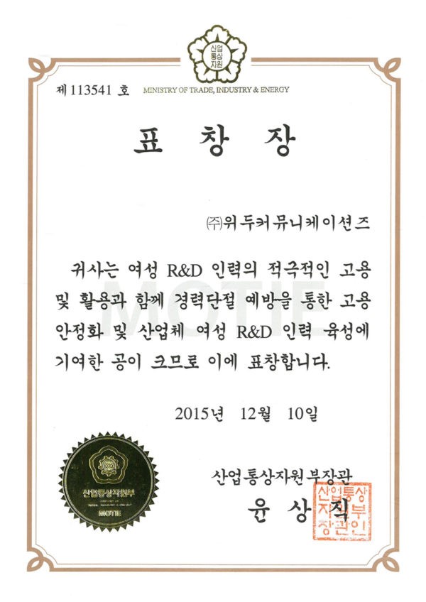 산업통상자원부 표창장 페이지 정보 작성자 WeDu 댓글 0건 조회 6,286회 작성일 19-05-30 19:34 본문 2015-12-10 표창장 제 113541호 여성 R&D 인력 고용 산업통상자원부장관 윤상직 List Previous서울클러스터 어워드 우수상 19.05.30 Next감사장 제 143호 19.05.30