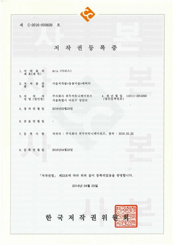 [한국/저작권] 아리스 페이지 정보 작성자 WeDu 댓글 0건 조회 6,352회 작성일 19-05-30 19:09 본문 2016-04-22 저작권 C-2016-009839 아리스 / 미술저작물>응용미술>캐릭터 List Previous[한국/저작권] 필립 19.05.30 Next[한국/저작권] 리안 19.05.30