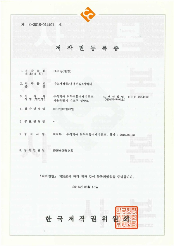 [한국/저작권] 필립 페이지 정보 작성자 WeDu 댓글 0건 조회 6,080회 작성일 19-05-30 19:09 본문 2016-06-14 저작권 C-2016-014401 필립 / 미술저작물>응용미술>캐릭터 List Previous[한국/저작권] 월터 19.05.30 Next[한국/저작권] 아리스 19.05.30