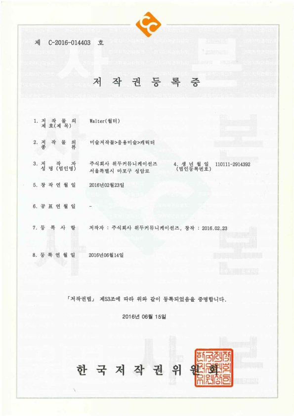 [한국/저작권] 월터 페이지 정보 작성자 WeDu 댓글 0건 조회 6,128회 작성일 19-05-30 19:09 본문 2016-06-15 저작권 C-2016-014403 월터 / 미술저작물>응용미술>캐릭터 List Previous[한국/저작권] 파벨 19.05.30 Next[한국/저작권] 필립 19.05.30