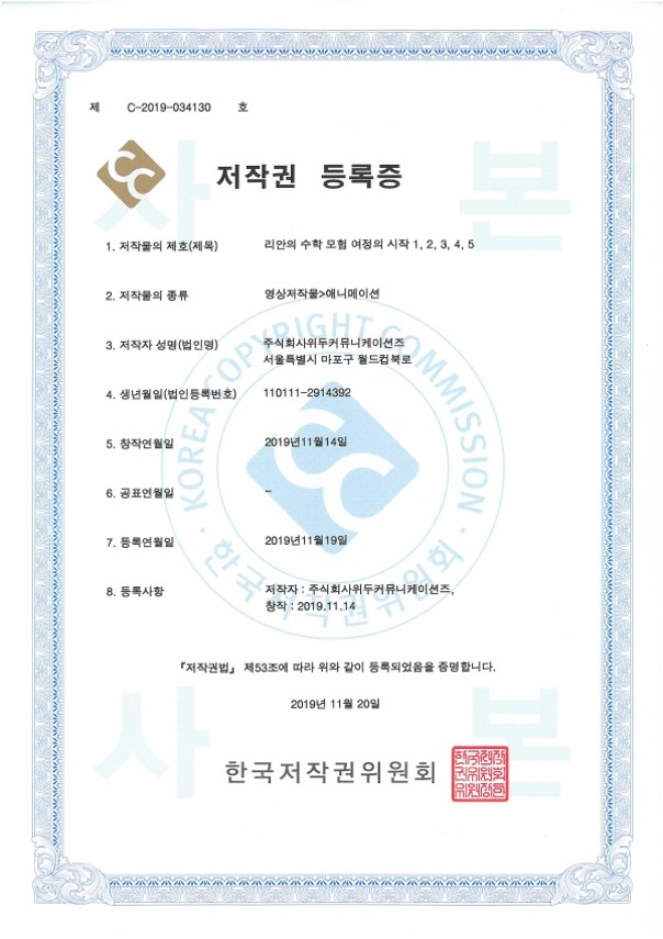 [한국/저작권] 리안의 수학 모험 여정의 시작 1,2,3,4,5 페이지 정보 작성자 WeDu 댓글 0건 조회 6,032회 작성일 21-12-31 12:36 본문 2019-11-20 저작권 C-2019-034130 영상저작물>애니메이션 List Previous[한국/저작권] OLL KIDS/MATH 21.12.31 Next[한국/저작권] 리안의 수학 모험 애니메이션 OST 19.11.25
