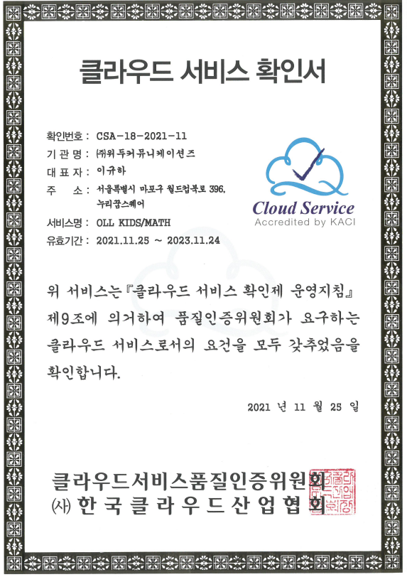 [한국/인증서] OLL KIDS/MATH 클라우드 서비스 확인서 페이지 정보 작성자 WeDu 댓글 0건 조회 9,832회 작성일 21-12-31 12:46 본문 2021-11-25 확인번호 CSA-18-2021-11 서비스명 : OLL KIDS/MATH List Previous[한국/확인서] OLL KIDS/MATH 파스-타 호환성 확인서 21.12.31 Next[한국/저작권] 장보기 인지훈련 게임 21.12.31