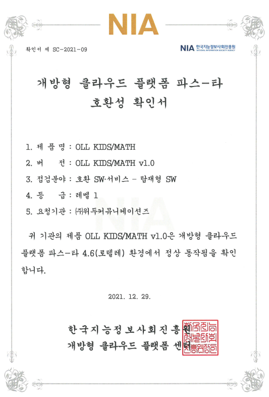 [한국/확인서] OLL KIDS/MATH 파스-타 호환성 확인서 페이지 정보 작성자 WeDu 댓글 0건 조회 10,481회 작성일 21-12-31 12:48 본문 2021-12-29 확인서 제 SC-2021-09 점검분야 : 호환 SW서비스 - 탑재형 SW List Next[한국/인증서] OLL KIDS/MATH 클라우드 서비스 확인서 21.12.31
